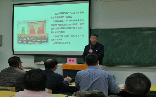 陈信书记在宣讲中提到,党的十九届四中全会是在世界面临百年未有之大变局,国际形势风云变幻,国内改革攻坚,推进高质量发展,“两个一百年”的历史交汇期,“不忘初心、牢记使命”主题教育取得明显成效的关键节点召开的。在关于《决定》的说明中,习近平总书记强调了三点背景:这是实现两个一百年奋斗目标的重大任务、这是新时代改革开放推向前进的根本要求、这是应对风险挑战赢得主动的有力保证。陈信书记主要结合《决定》、公报和关于决定起草的说明等,就十九届四中全会精神重点讲解全会召开的重要战略意义、全会指明国家治理的总体要求和总体目标、全会总结我国制度建设的历史逻辑和实践逻辑、全会总结我国国家制度和国家治理体系的显著优势、全会系统描绘中国特色社会主义制度图谱、怎样落实十九届四中全会精神六个问题做专题讲解。
