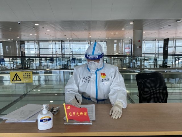 会上,陈军与学生党员积极互动。“我们一定要将有风险的人群控制,绝不漏放、也不错留一个旅客。同时,也要用耐心、贴心去温暖每一个归国的游子。”话语刚落,陈军的护目镜已被雾气所模糊,但是铿锵话语和坚定的目光让师生党员久久不能忘怀。