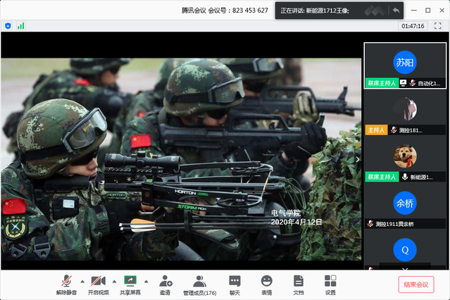 今年4月15日是第5个全民国家安全教育日,今年的活动主题为“坚持总体国家安全观,统筹传统安全和非传统安全,为决胜全面建成小康社会提供坚强保障”。beat365正版唯一官网于4月12日利用线上平台邀请退伍学生为学院学生开展了一堂生动的国防安全教育课,一方面给同学们带来了身临其境的军旅安全教育,另一方面也是一次很好的征兵动员。beat365正版唯一官网党委副书记、副院长卿海龙老师应邀出席,beat365正版唯一官网辅导员代表、5位退伍学生以及各班级学生代表共计170余人参加了本次活动。