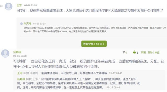 线上授课的六周里,共设计了11个讨论主题,将立德树人作为主线理念,将技术报国、家国情怀、职业品质、工匠精神等思政育人目标融入到讨论中。事实证明同学们对于结合当下时事的主题非常感兴趣,说明当代大学生对于国家的发展和民族的命运十分关心,通过这些主题的讨论,培养了同学们进一步学习技术知识的兴趣,帮助学生树立技术强国的爱国报国情怀。对于同学们的留言,王芳老师都一一给予了点评和回复,进一步也引发了同学们对社会发展问题的思考。