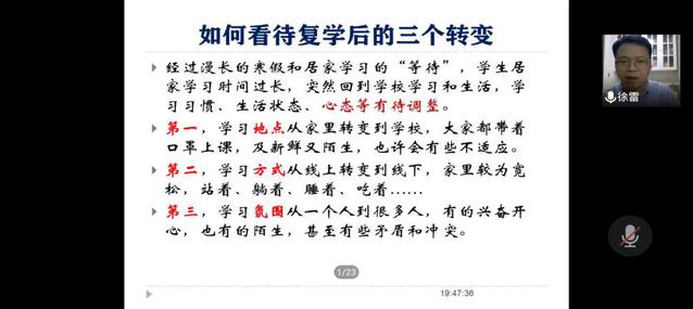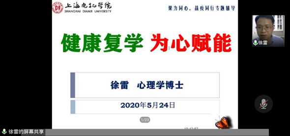 5月24日晚,来自beat365正版唯一官网心理协会成员、班级心理委员、宿舍心理观察员,以及各班代表齐聚腾讯会议云端,聆听徐雷老师以“健康复学,为心赋能”为主题的心理辅导。