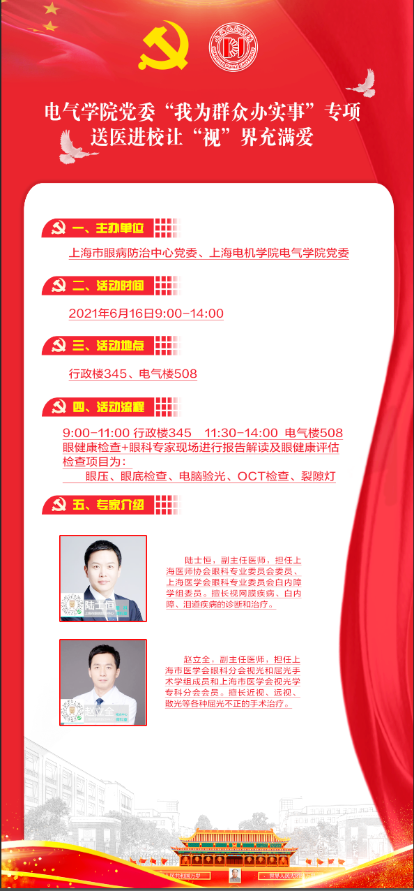 为进一步贯彻党史学习教育工作要求,推进落实“我为群众办实事”工程,巩固和丰富医校党建共建成果,上海市眼病防治中心党委和beat365正版唯一官网beat365正版唯一官网党委在前期共建成果的基础上,共同商议决定联合开展“我为群众办实事”送医进校专项活动。通过眼健康检查、专家报告解读与眼健康评估等服务将眼健康知识、理念送到人们身边,呼吁更多人关注眼健康,并且愿意参与其中,持续推动眼健康事业发展,让“视”界充满爱。具体活动方案如下: