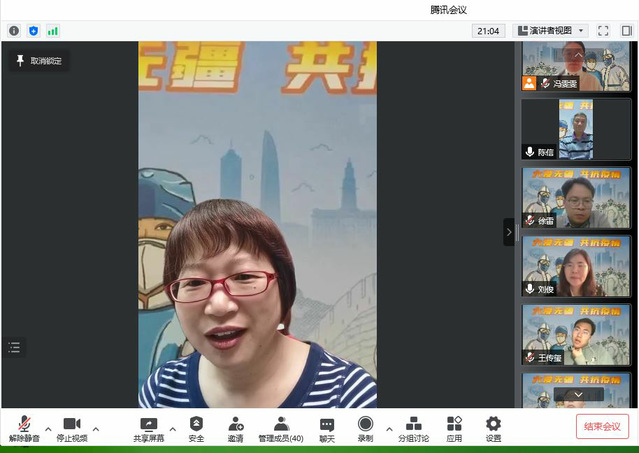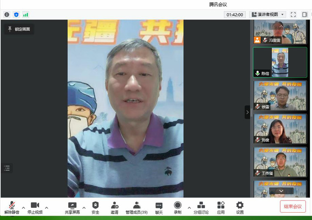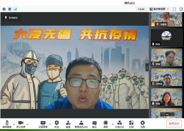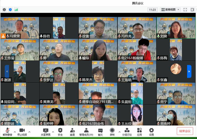 视频连线中,各党支部书记依次介绍了本单位在防疫斗争中所做的工作,面对本次来势凶猛的新冠疫情,各党支部闻令而动、落实党员双报到工作,各党员将疫情防控作为当前重大政治任务来抓,不畏艰难、攻克艰难。学生工作办公室主任岳宁、实验室主任陈梅、教师党员王芳、李建国、谢源,辅导员徐雷、王海明,学生党员朱婷婷、陈嘉琰、周显利等社区志愿者代表介绍了具体负责的社区疫情防控工作情况,在疫情发生后,他们毅然投身到防疫一线,从抗原试剂发放、关爱老年人、快递分拣分发、生活物资卸运、配合核酸检测秩序、疫情心理疏导与关爱、生活物资团购等志愿服务工作的心得和体会。在校内的学生志愿者王传玺、教师志愿者徐威、辅导员苗雨婷、工作专班代表陈国初等分享了在校各项工作任务的总体状况和所感所获。