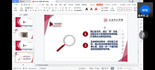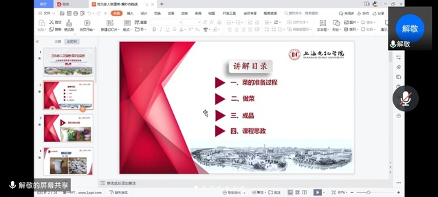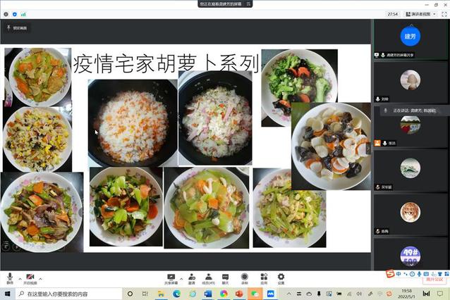 晚上19:30学院老师腾讯会议云聚会,一一分享了这些菜制作的过程以及背后的故事,有北方老师的“好吃不过饺子”的主题点心系列,有教授们“简单食材功夫到位”系列,有“生活需要一丝甜蜜”系列、有作为年轻教师们“色香营养俱全:爱吃爱吃”系列,有家住乡下教师新鲜食材从采摘到上桌不到两小时的“一切都是最新鲜”的系列,更有食材来自学校发放的大礼包之“爱心秀出来”系列等等。