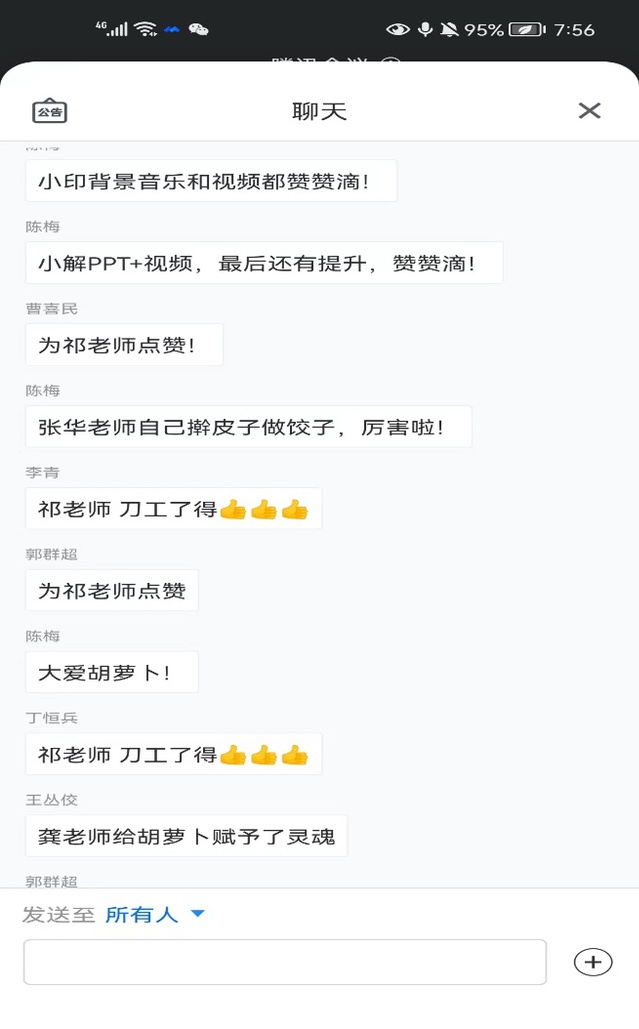 介绍菜品的同时,聊天画面也热火朝天,广大教师在互动页面纷纷打call。“刚好不知道洋葱肥牛盖浇饭怎么做,这菜谱和视频来地太及时了”“我明天试试拔丝地瓜,做给孩子们尝尝”“这道爆炒杏鲍菇我喜欢,通过解老师的视频讲解,反正我的眼睛是学会了,明天用学校发的物资里的杏鲍菇亲自动手试试”,在线上介绍菜品制作的同时,老师们在聊天区纷纷点赞,并摩拳擦掌准备跃跃欲试。