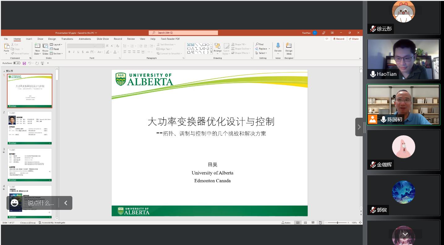 8月28日上午,beat365正版唯一官网邀请加拿大阿尔伯塔大学博士后田昊为学院教师及研究生作了“大功率变换器优化设计与控制——拓扑、调制与控制中的几个挑战和解决方案”的线上学术讲座,讲座由院长陈国初主持。