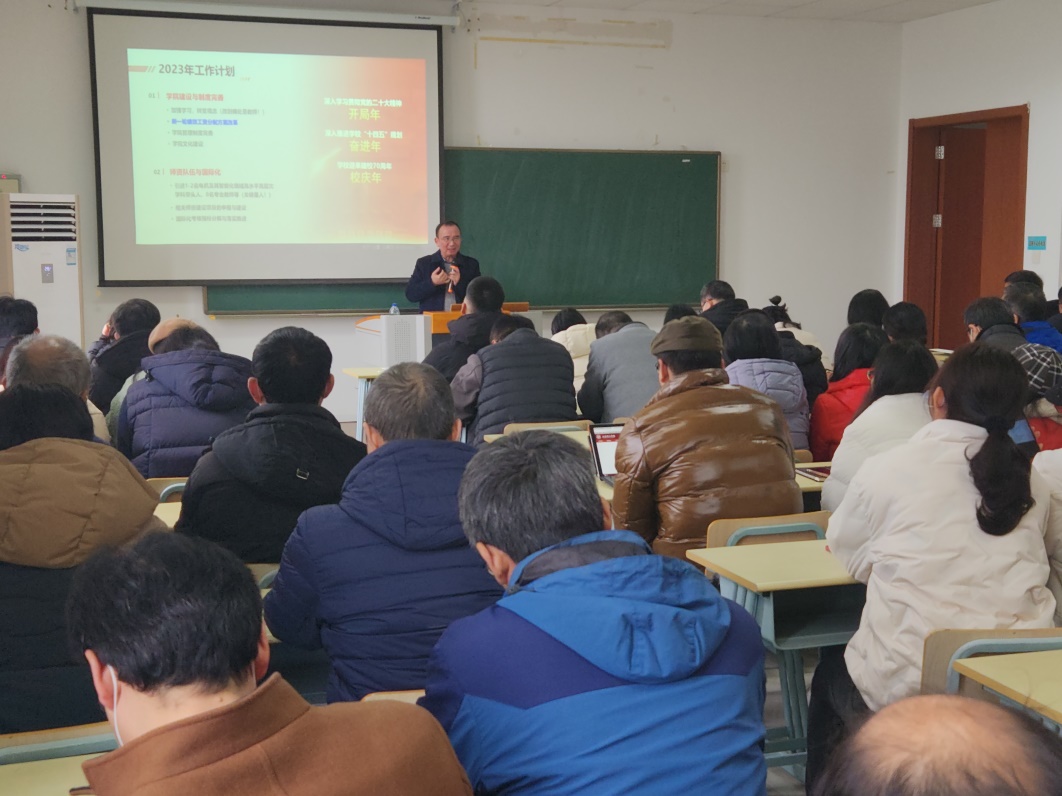 陈国初介绍了学院新进教师情况并作了《学习贯彻党的二十大精神 有组织开展教学与科研 推进学院高质量发展》的专题报告,报告回顾了学院寒假期间工作开展情况和取得的成效,就学院建设与制度完善、师资队伍与国际化、70周年校庆、科研与研究生工作、教学与学生工作等对2023年度工作进行了部署安排,并提出了要求。2023年是贯彻落实党的二十大精神的“开局之年”、是深入推进“十四五”规划的“奋进之年”、是学校庆祝建校70周年的“校庆之年”。陈国初表示在深入学习党的二十大精神的基础上,根据学院的“十四五”规划,结合年度目标和任务,深化产教融合,提升人才培养质量;要继续加强团队建设,做有组织的教学与科研;全体教职工要立足岗位,心往一处想、劲往一处使,推进学院高质量发展。各条线负责人分别就近期的教学、科研和学生工作作了补充。