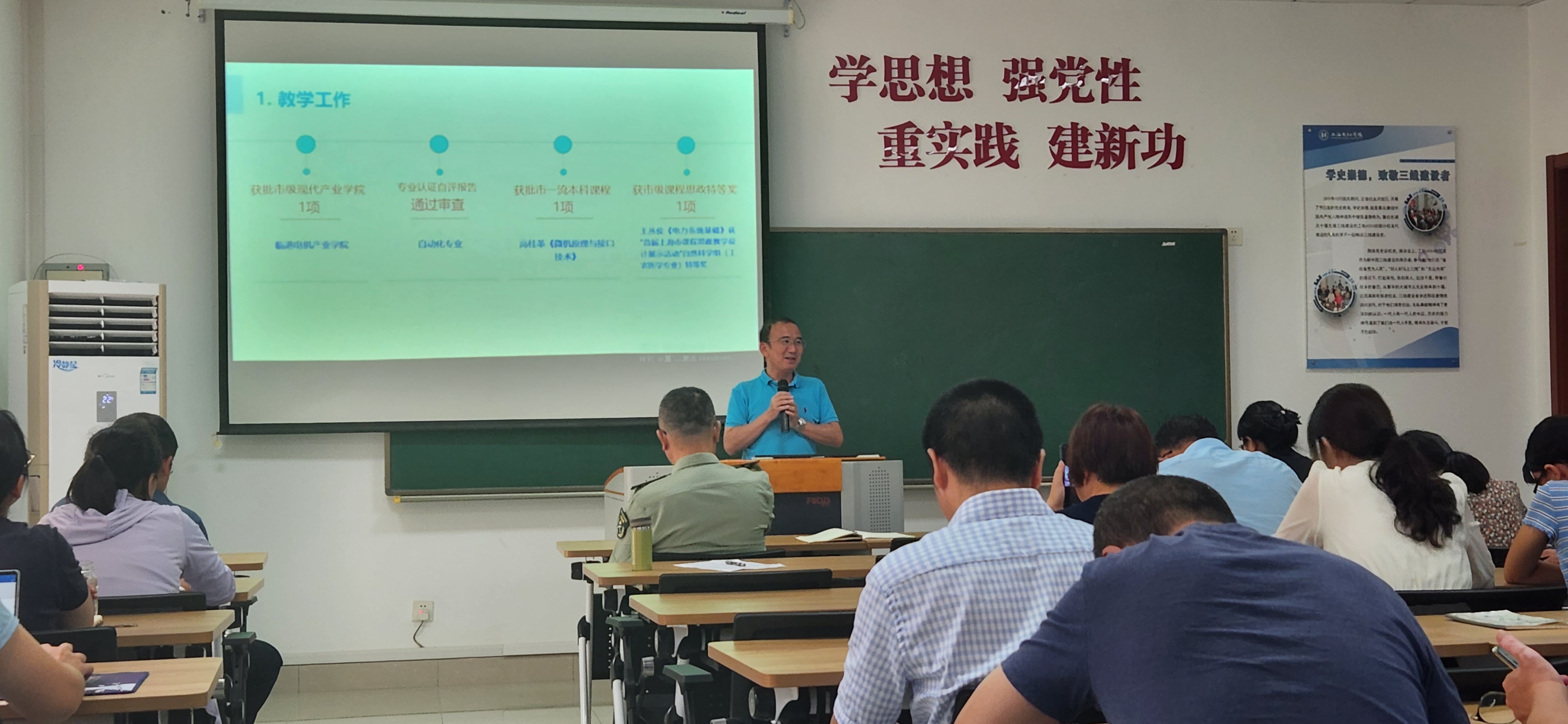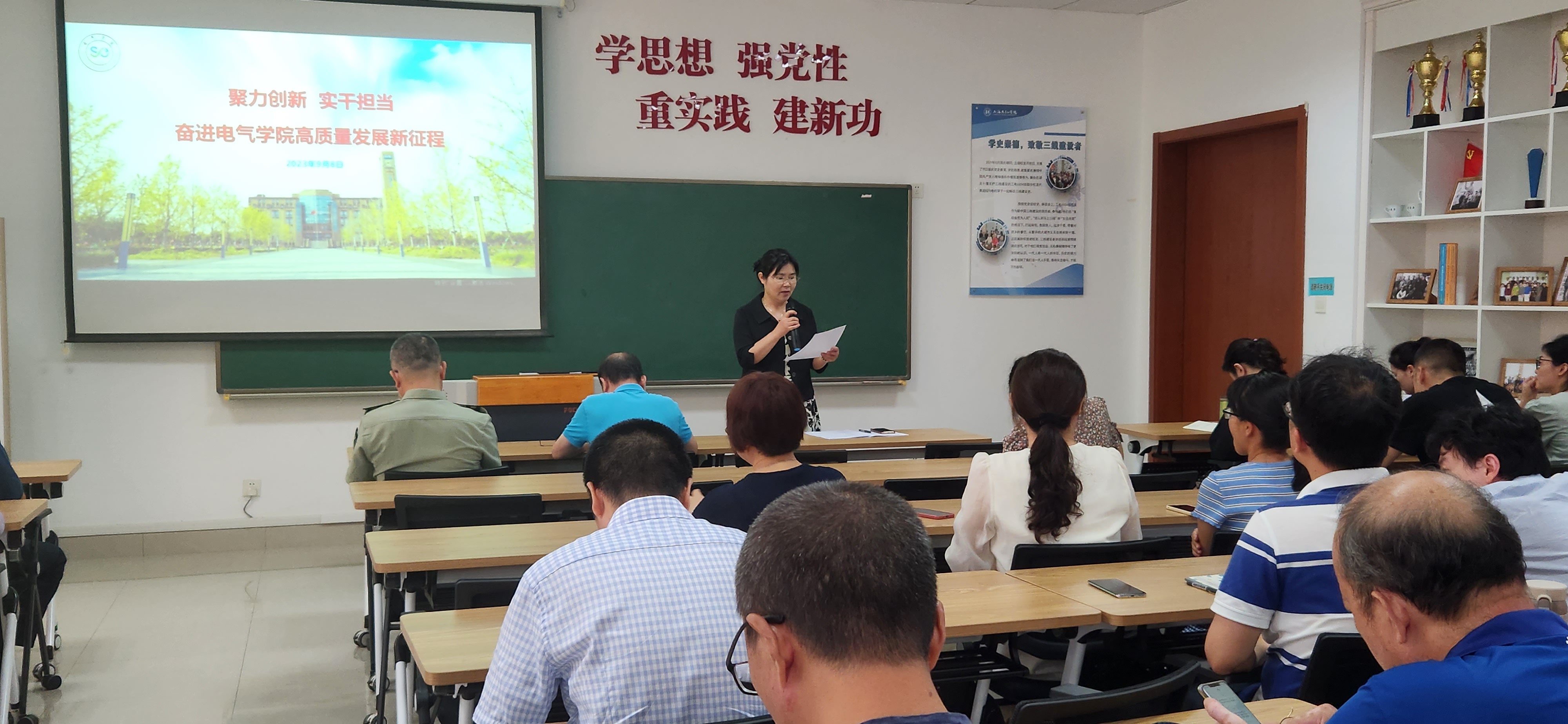 陈国初院长介绍了学院新进教师情况并作了《聚力创新 实干担当奋进电气学院高质量发展新征程》的专题报告,报告回顾了学院上半年及暑期工作开展情况和取得的成效,对学院年度关键目标任务完成现状作了分析,就开学稳定、70周年校庆、审核评估、学科科研、人才引进等本学期重点工作进行了部署安排,并提出了要求。他表示要根据学院的“十四五”规划,结合年度目标和任务,理解新问题,把握事业高质量发展的关键性问题;认清形势,聚力创新再出发,撸起袖子加油干。(撰稿:蓝媛媛;摄影:张洁;审核:刘俊)