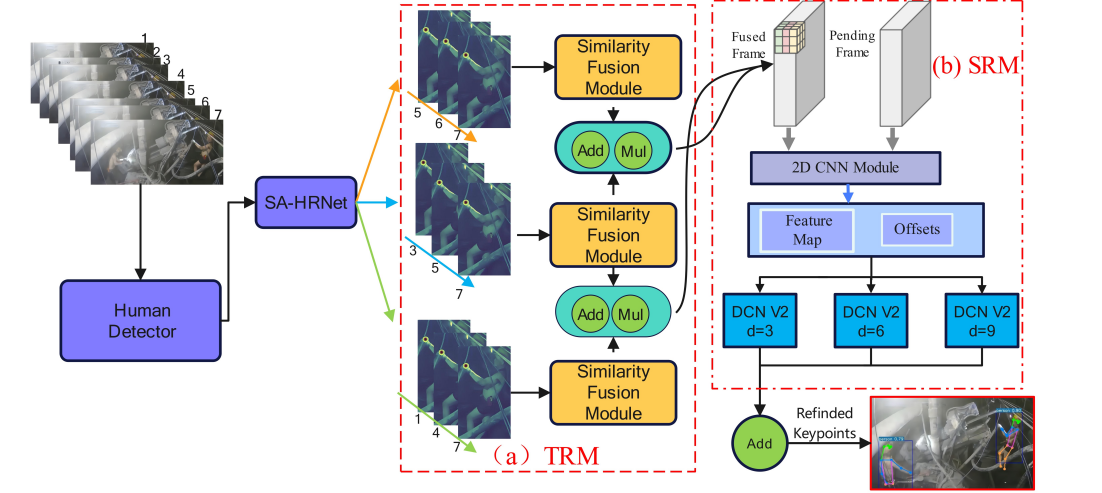 在复杂的工业场景下进行人体姿态估计是具有挑战性的。该场景下的监控视频帧存在亮度不均匀、图像细节模糊和噪声过多等问题。最新主流的人体姿态估计方法对高质量的静态图像具有良好的检测性能,但在工业场景中,模型的准确性和预测率会大幅度降低。针对这些问题,智能决策与控制技术研究团队提出了一种适用于复杂工业场景下的人体姿态估计方法YH-Pose,该框架努力合并来自邻近视频帧的额外视觉证据,以促进当前帧的姿态估计。首先,引入一个人检测器来定位人在视频帧中的位置并提取全局特征。这可以为后面关键点检测提供很好的初始化,使训练过程快速收敛。其次,利用热图对关节位置进行编码为高斯峰值,并设计了一个时间道路模块(TRM),以一定的间隔对视频帧进行编码。该模块通过不同帧率进行分组融合时空信息。最后,空间道路模块(SRM)从融合的关键点上下文特征中进行学习,并预测下一帧中的关键点的位置。此外,团队还提出了一个名为Colliery-1的工业场景人体姿态估计通用数据集,在Colliery-1数据集上的实验结果表明,该框架在训练集和测试集上的平均准确率分别为82%和80%。此外,该框架对人体姿态的预测率为94.2%,达到了SOTA,为复杂工业场景下的人体行为识别研究做出了贡献。