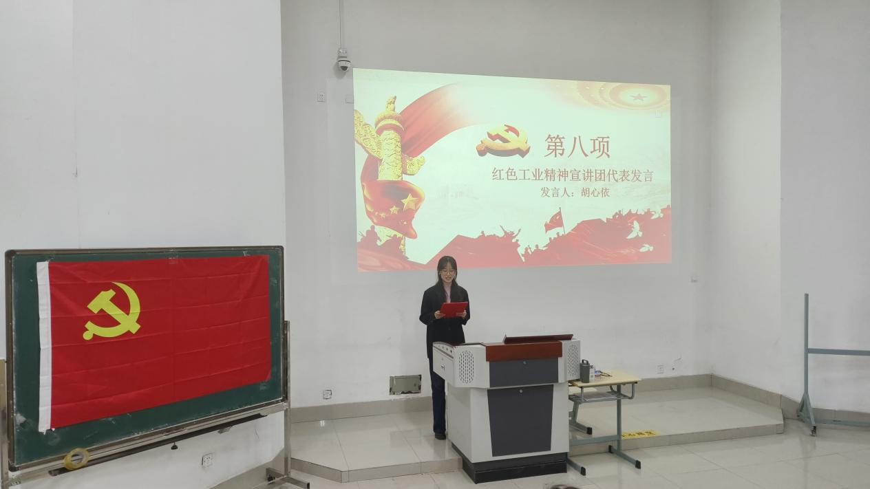 宣讲团代表胡心依同学作为第一批红色工业精神宣讲团成员在发言中表示,作为宣讲团成员,承担着红色文化和精神传播的责任,感到无比的光荣和自豪,同时也感受到了任务的艰巨,希望通过宣讲团这一个纽带让更多的同学在传承精神中将小我融入大我,汇聚成为一支充满探索激情、勇于开拓的社会实践队伍,再将专业成长与精神品格塑造紧密结合,做中国红色工业基因的传承人。