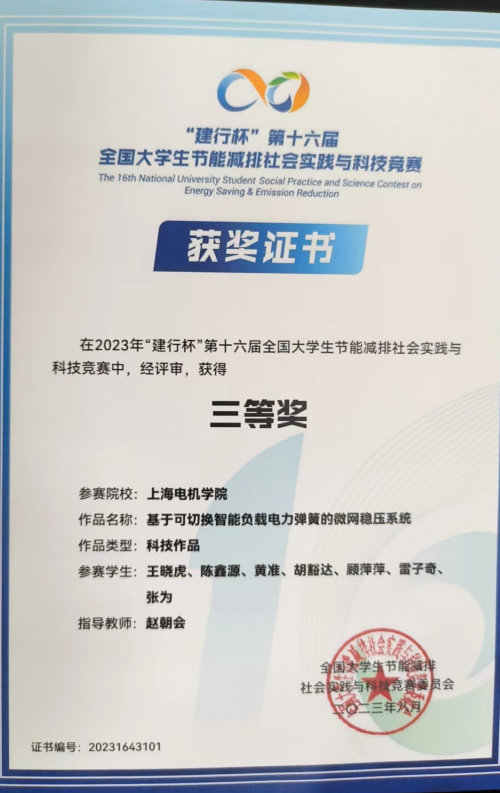 近日,2023年“建行杯”第十六届全国大学生节能减排社会实践与科技竞赛结果公布,我校beat365正版唯一官网赵朝会教授指导,王晓虎、陈鑫源、 黄准、 胡豁达、雷子奇、 顾萍萍、 张为等学生共同完成的参赛作品《基于可切换智能负载电力弹簧的微网稳压系统》荣获国家三等奖。