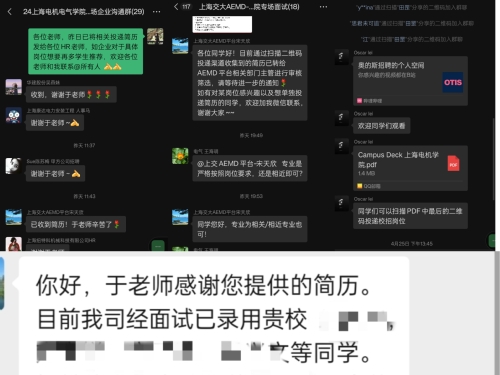 招聘会上,上海交大AEMD平台、奥的斯电梯管理(上海)有限公司、上海华建电力设备股份有限公司、上海同盛电力有限公司、凯思勒传动技术(上海)有限公司、上海太易检测技术有限公司、上海北羽自动化科技有限公司、富奥汽车零部件股份有限公司、特来电新能源股份有限公司、上海贺通人力资源管理(集团)有限公司、上海新华控制技术集团科技有限公司、上海纽特科机械科技有限公司、上海中车艾森迪海洋装备有限公司、上海康达电力安装工程有限公司等通过PPT宣讲、播放宣传片等方式向同学们介绍了企业概念,招聘岗位职责要求、工作地点、薪资及福利待遇等。为便于企业与学生更好地交流,beat365正版唯一官网为每家参加宣讲企业专门建立了微信面试群。