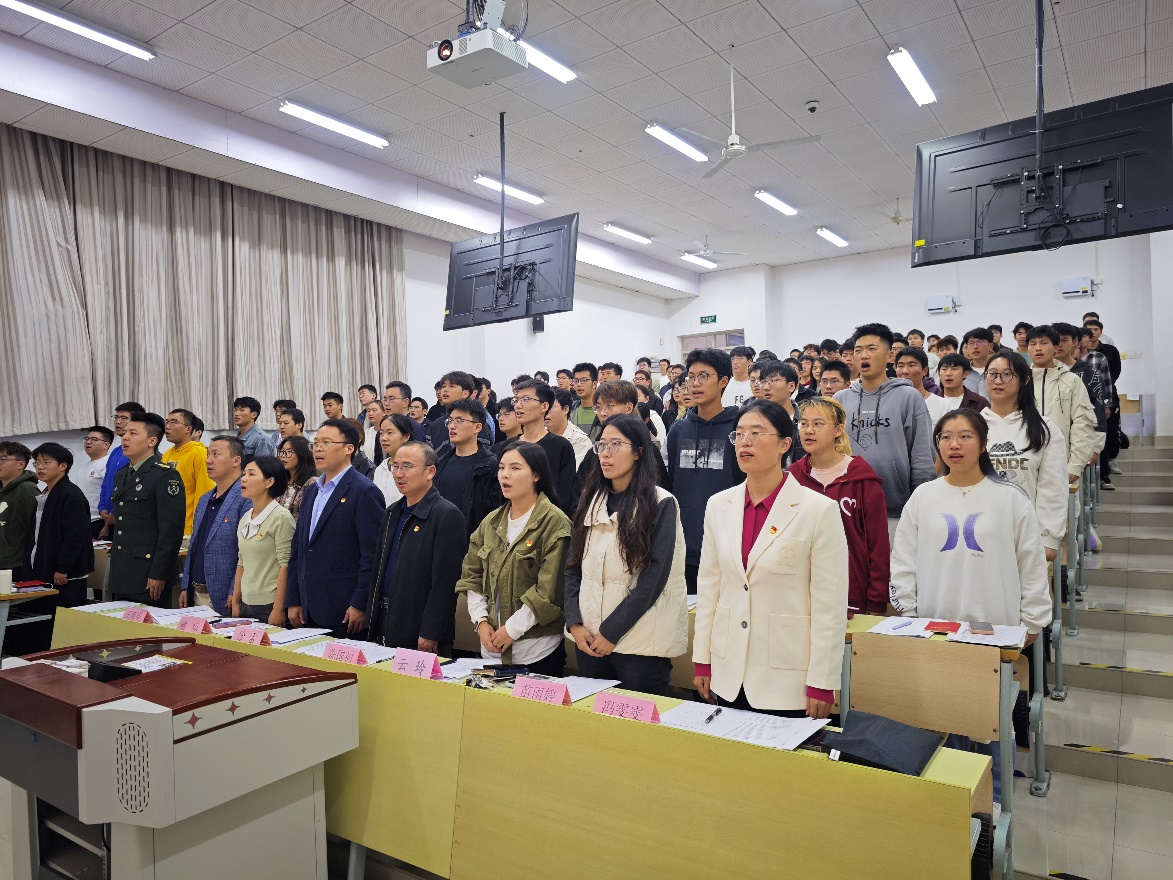 全体起立奏唱国歌,激昂的旋律在会场回荡,开班典礼的帷幕由此拉开。学院团总支书记云玲老师首先介绍了团组织推荐入党积极分子人选情况,并为学院第二次红色工业精神宣讲团成员颁发聘书,鼓励他们当好红色工业精神宣传员,引导传承和发扬“艰苦创业、无私奉献、团结协作、勇于创新”的三线精神。专职组织员冯雯雯老师详细介绍了本期入党积极分子培训班的基本情况、培训日程安排,培训班涵盖理论素养提升、党性实践教育和学习体悟分享等内容,通过专题报告、小组研讨、红色观影、志愿服务、校内外红色教育基地参观学习等形式提升培训质量效果,并进一步强调了党校纪律要求和学习结业要求。