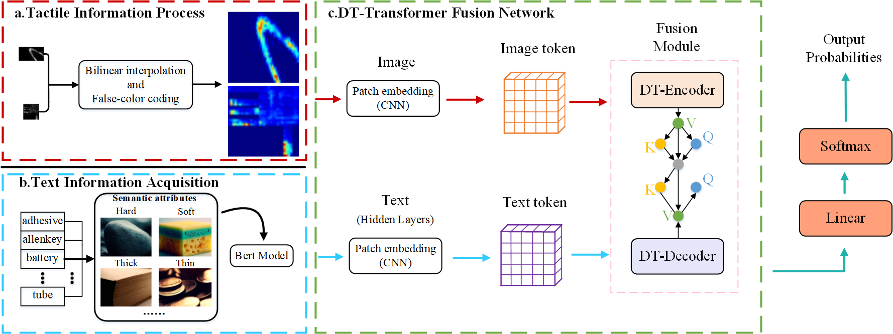 对此,研究团队提出DT-Transformer网络:一个从触觉和文本数据中学习的新框架。通过多头关注机制实现了一种基于Transformer网络的专门融合机制,以解决这些不同信息类型融合的挑战。相关研究成果以“DT-Transformer: A Text-Tactile Fusion Network for Object Recognition”为题,发表在触觉领域知名期刊《IEEE Transactions on Haptics》(IF 2.4,中国科学院三区)上。该研究成果以beat365正版唯一官网为第一单位,在读硕士生邱圣杰为第一作者,李保江老师为通讯作者。