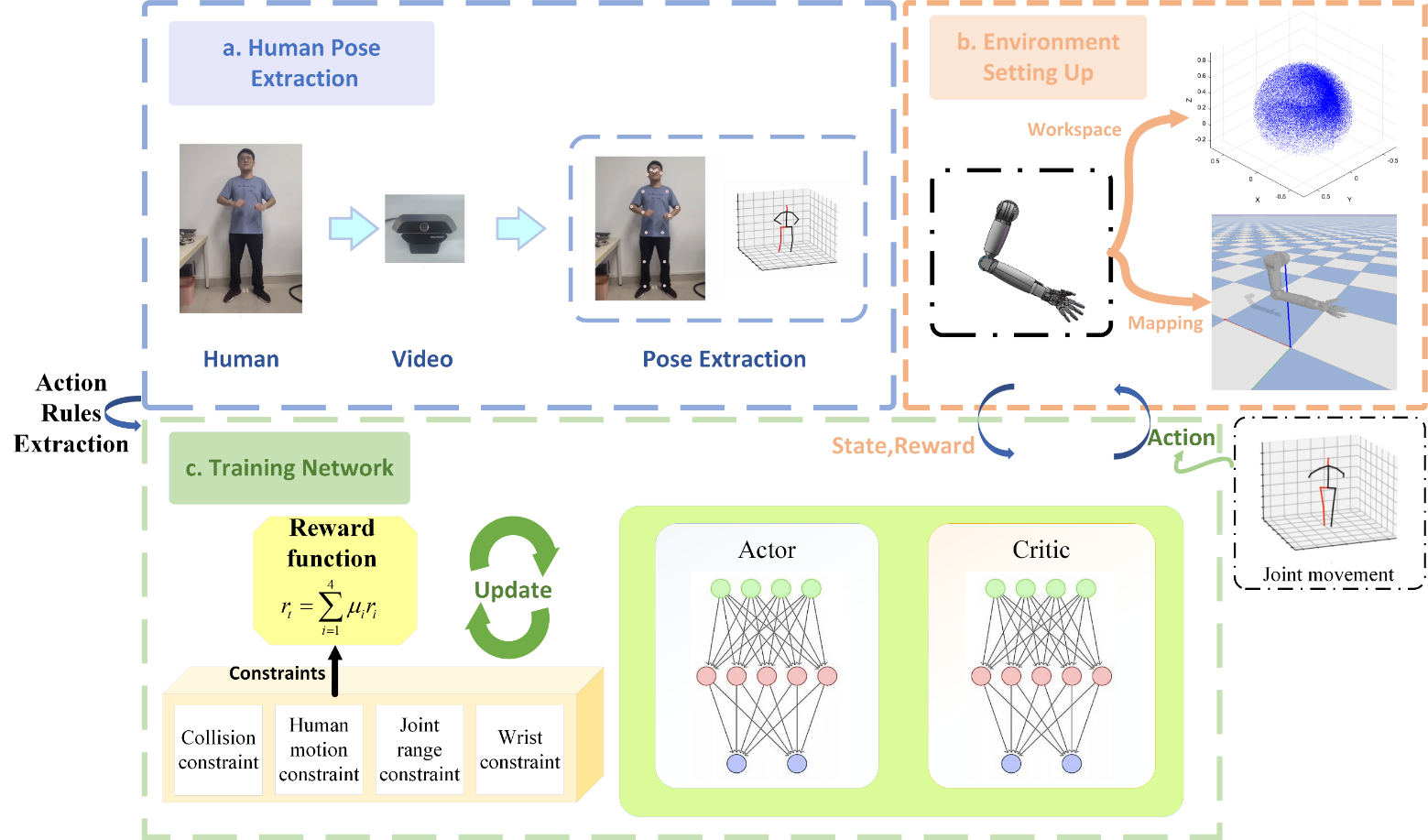 针对这一问题,研究团队提出了一种基于人体上肢关节点引导的运动模仿和基于强化学习方法的运动规划算法,通过学习模仿人体上肢的运动姿态,达到仿生手臂完成仿人运动的目的。相关研究成果以“Motion planning for 7-degree-of-freedom bionic arm: Deep deterministic policy gradient algorithm based on imitation of human action”为题,发表在人工智能领域知名期刊《Engineering Applications of Artificial Intelligence》(IF 7.5,中国科学院二区,Top期刊)上。该研究成果以beat365正版唯一官网为第一单位,李保江老师为第一作者及通讯作者,在读硕士生邱圣杰为第二作者。