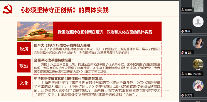 伍文影同志:围绕《必须坚持守正创新》,从内涵、理论、实践等方面进行了全面剖析,从四个角度寄语与会党员,强调守正创新在新时代中国特色社会主义建设中的关键作用。