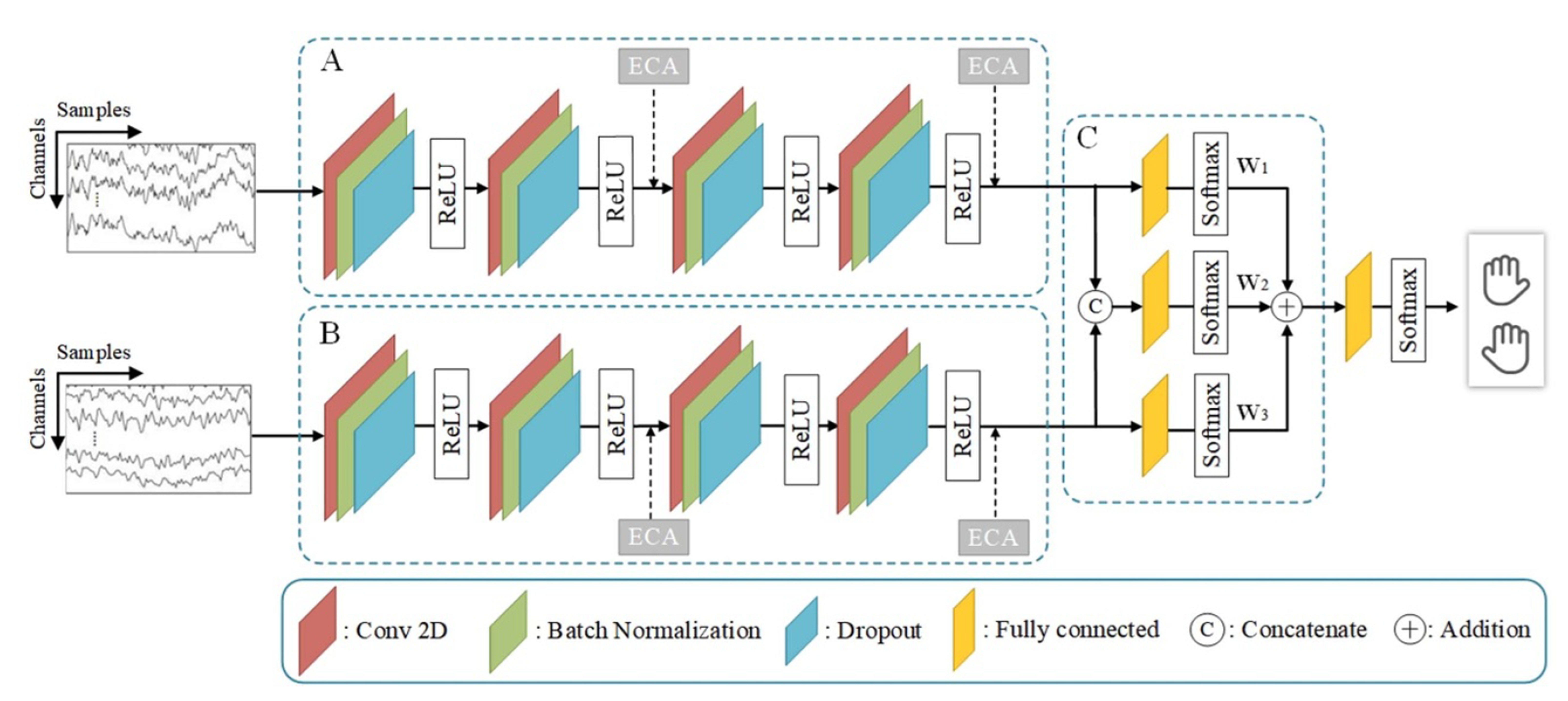 ECA-FusionNet分类网络能够结合EEG和fNIRS潜在的互补优势。采用特征提取网络从基于EEG和fNIRS的MI信号中提取时空特征;在特征层和决策层先后融合了EEG和fNIRS,以提高模型的适应性和鲁棒性。该研究成果为多模态信号融合分类领域提供有益的参考。